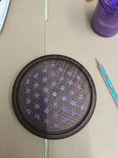 Mandala ,,Květ života´´, malovaná akrylovými barvami na dřevěný mahagonový rámeček o průměru 14 cm. Přidán minerál - Růženín . Na zadní straně dírka k možnosti zavěšení .