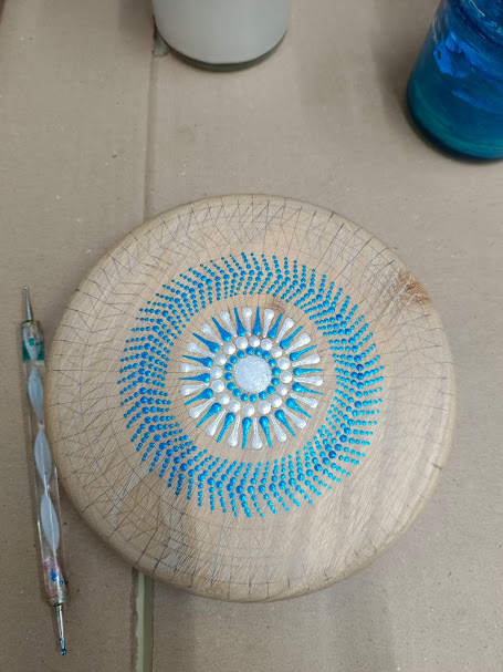 Mandala ,,Vnitřní vyrovnanost´´, malovaná akrylovými barvami na dřevěném rámečku o průměru 14 cm. Přidán minerál - Shattuckit, Křišťál. Na zadní straně dírka na možnost pro zavěšení .